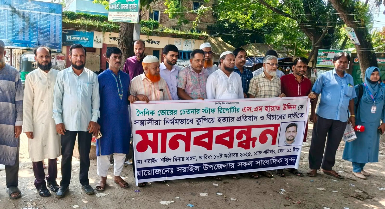 বাগেরহাট জেলার সাংবাদিক এ এস এম হায়াত উদ্দীনকে কুপিয়ে হত্যার প্রতিবাদ ও বিচার দাবিতে ব্রাহ্মণবাড়িয়ার সরাইলে সাংবাদিকদের মানববন্ধন অনুষ্ঠিত হয়েছে।