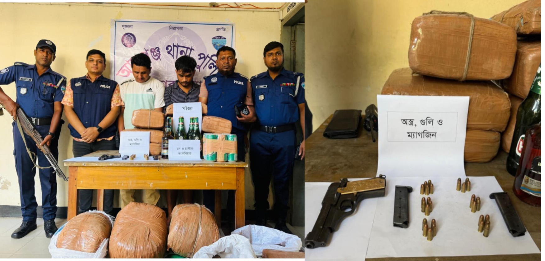 তল্লাশি করে গাড়ি থেকে একটি বিদেশি AUTO CAL-7.65 mm পিস্তল, দুটি ম্যাগাজিনসহ ৩০ রাউন্ড গুলি, ১১৫ কেজি গাঁজা, ১২ ক্যান বিদেশি বিয়ার ও ৬ বোতল হুইস্কি উদ্ধার করা হয়। উপস্থিত সাক্ষীদের সামনে এসব মালামাল জব্দ করা হয়।