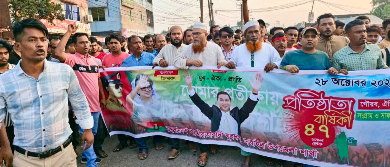 বাংলাদেশ জাতীয়তাবাদী যুবদলের গৌরবময় ৪৭তম প্রতিষ্ঠা বার্ষিকী পালিত হয়েছে। আজ (২৮, অক্টোবর অ) মঙ্গলবার উপলক্ষে ব্রাহ্মণবাড়িয়া সরাইল উপজেলা যুবদলের উদ্যোগে এক বর্ণাঢ্য ও উৎসবমুখর আনন্দ র্যালি অনুষ্ঠিত হয়। র্যালিটি সরাইলের প্রধান প্রধান সড়ক প্রদীক্ষণ করে নির্বাহী অফিসার অফিসের সামনে শেষ হয়ে আলোচনা সভা অনুষ্ঠিত হয়েছে। উপজেলা যুবদল নেতা গিয়াস উদ্দিন সোহাগ এর সভাপতিত্বে এবং যুবদল নেতা সাইফুল ইসলাম ও হাবিবুর রহমান বায়াছ এর যৌথ সঞ্চালনায় বক্তব্য রাখেন উপজেলা বিএনপি, যুবদল, ছাত্রদল ও কৃষকদলের অসংখ্য নেতা-কর্মী।